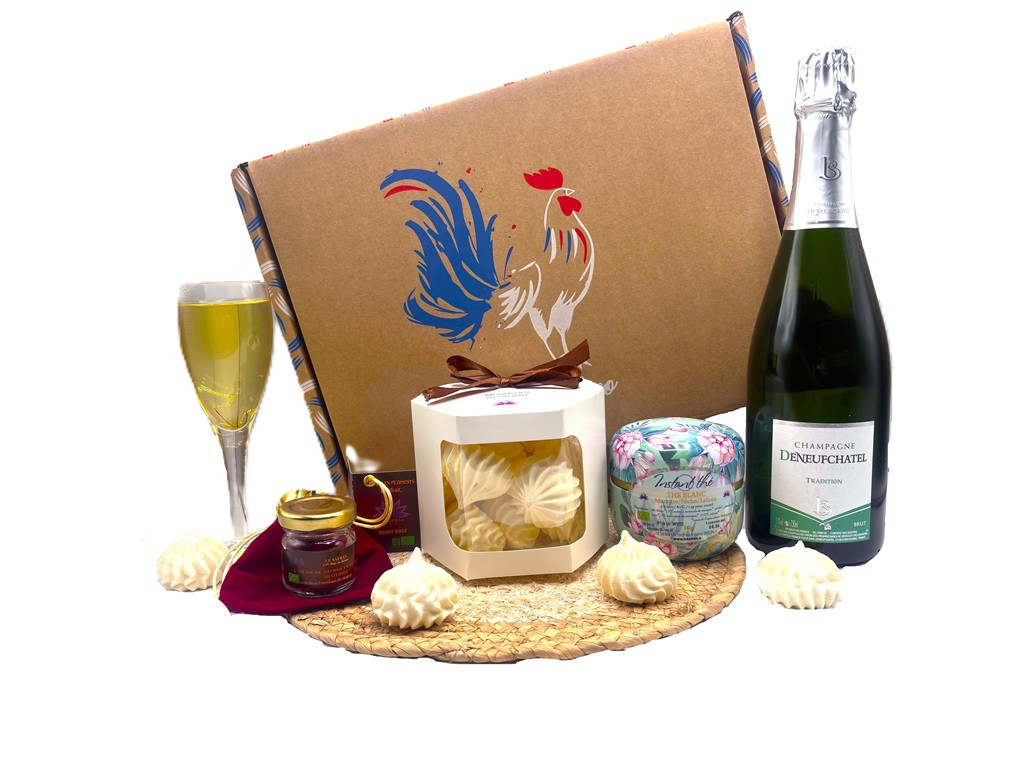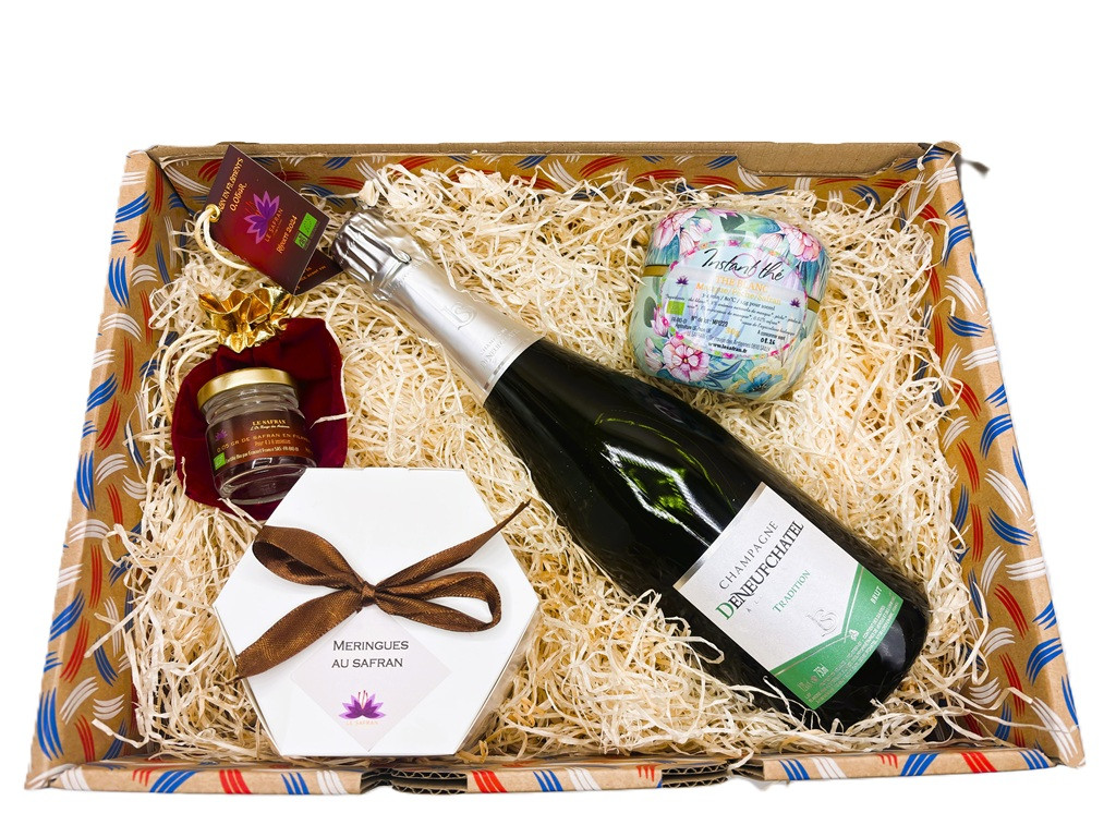 Coffret cadeau colis gourmand composé d'une bouteille de champagne AOC Brut, 75cl, d'un thé blanc mangue-pêche-safran, 30g, d'une boite de meringues à la françasie au safran, et de safran en filaments, 0.05g pour cuisiner 4 assiettes salées et 8 sucrées !